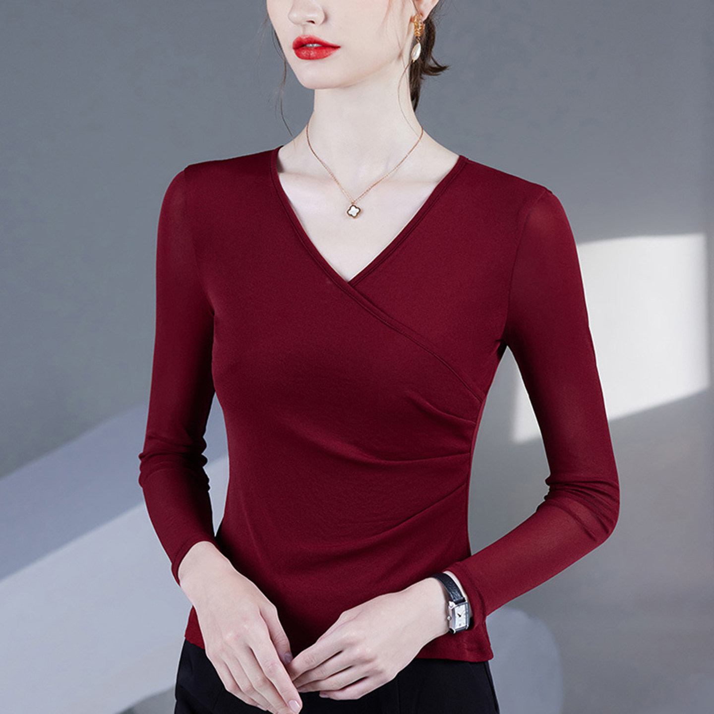 气质V领网纱打底衫女长袖沙体t恤别致收腰交叉领薄纱蕾丝上衣秋装