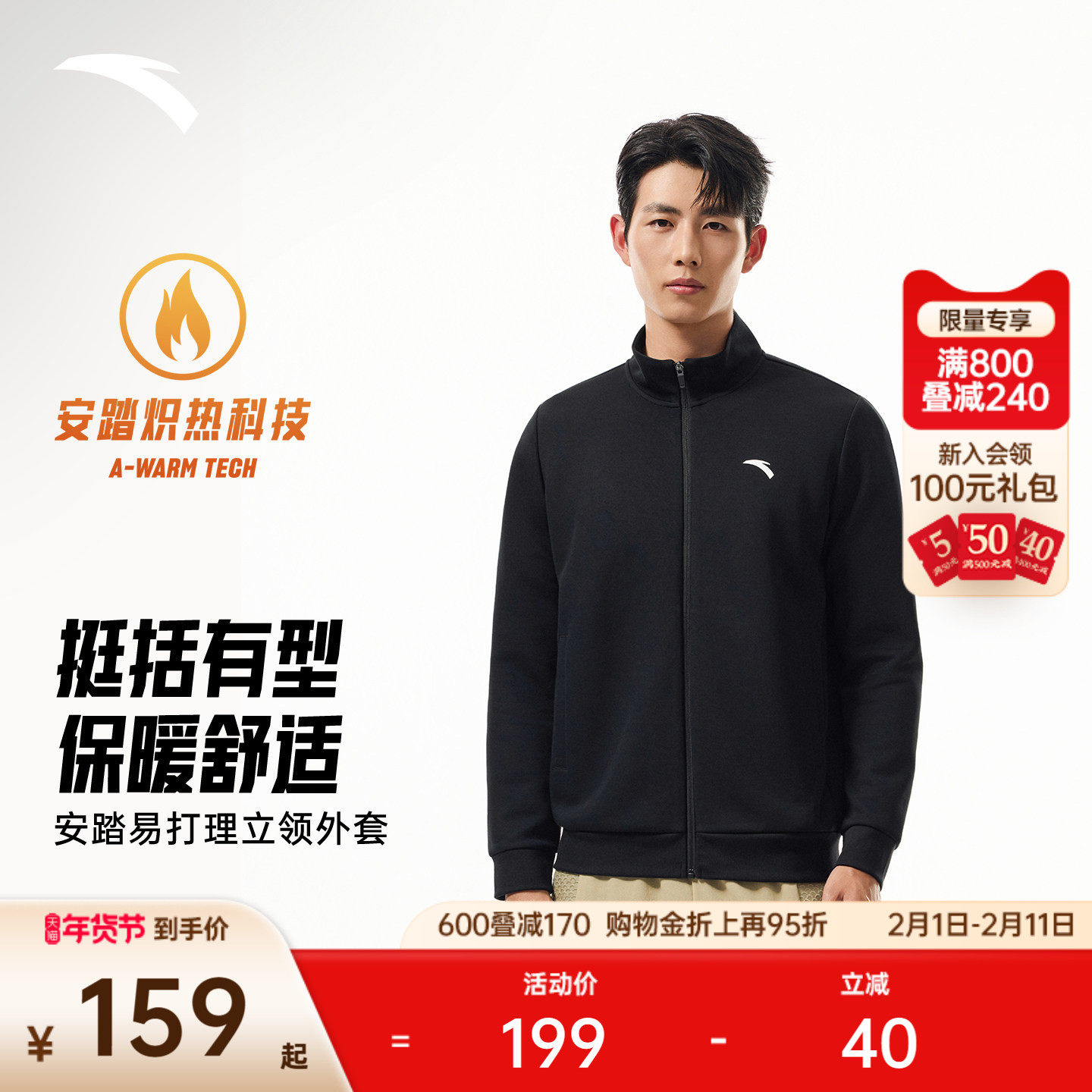 特步外套男秋冬新款男装运动上衣立领夹克开衫卫衣休闲加绒运动服