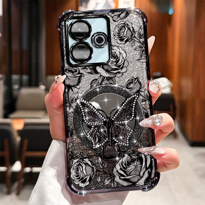 小米 POCOM6PLUS 手机壳 pocom6plus 高级感磁吸支架玫瑰印花带手链适用无线充电高透质感多色奢感高端防刮套