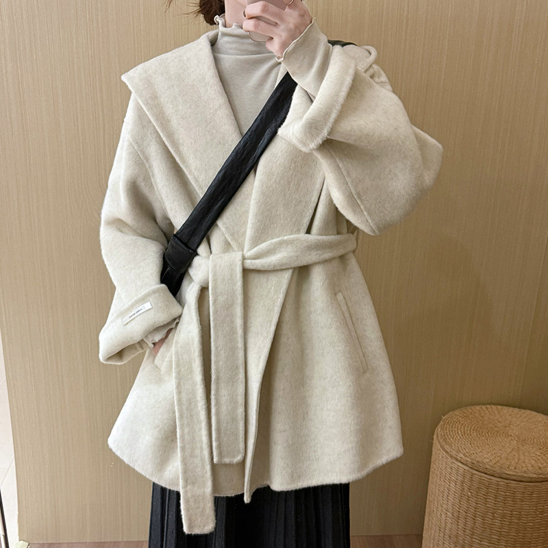韩系毛领双排扣短款连帽大衣女秋冬款收腰加厚系带高级感上衣外套