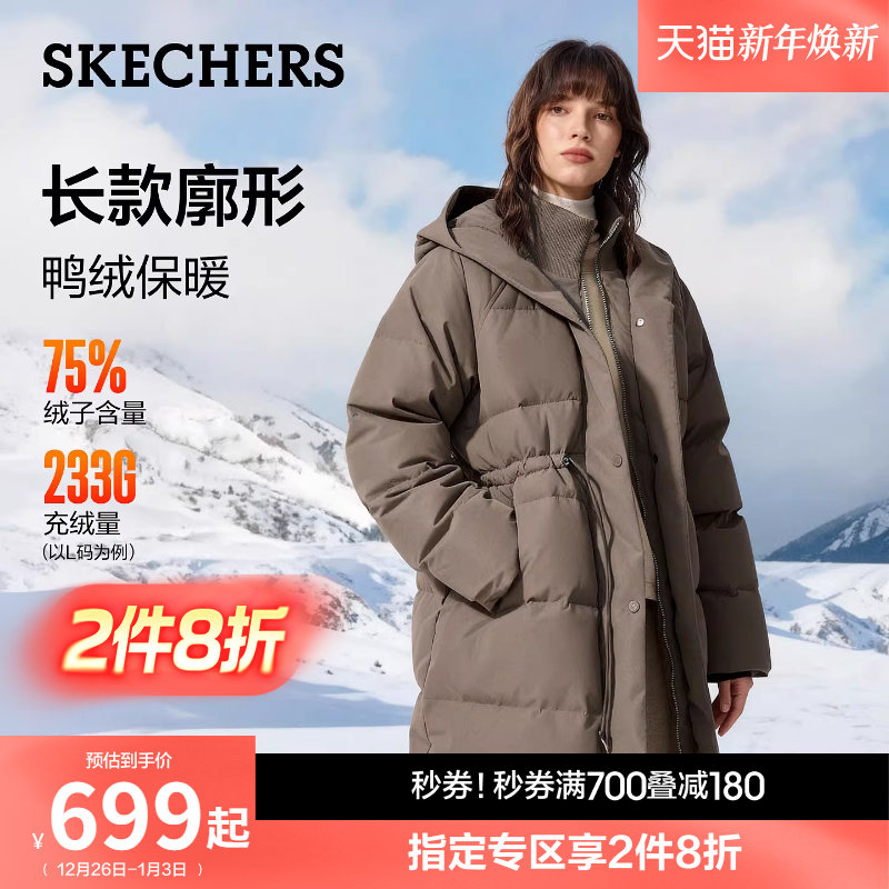 斯凯奇中长款羽绒服厚外套女2025冬季新款防风防泼水保暖收腰大衣
