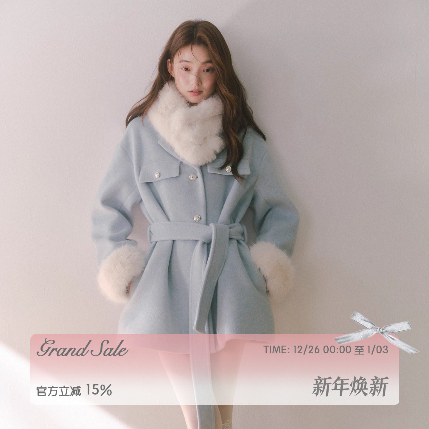 RECIT 冰岛蓝可拆卸毛领含羊毛大衣女冬季收腰系带中长款毛呢外套
