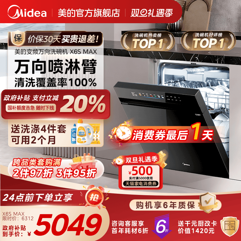 美的万向变频洗碗机家用全自动烘干消毒一体嵌入式18套X6SMax官方