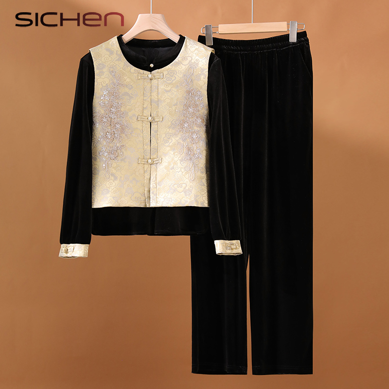中老年妈妈秋装洋气国风马甲三件套装中年女装春秋季金丝绒上衣裤