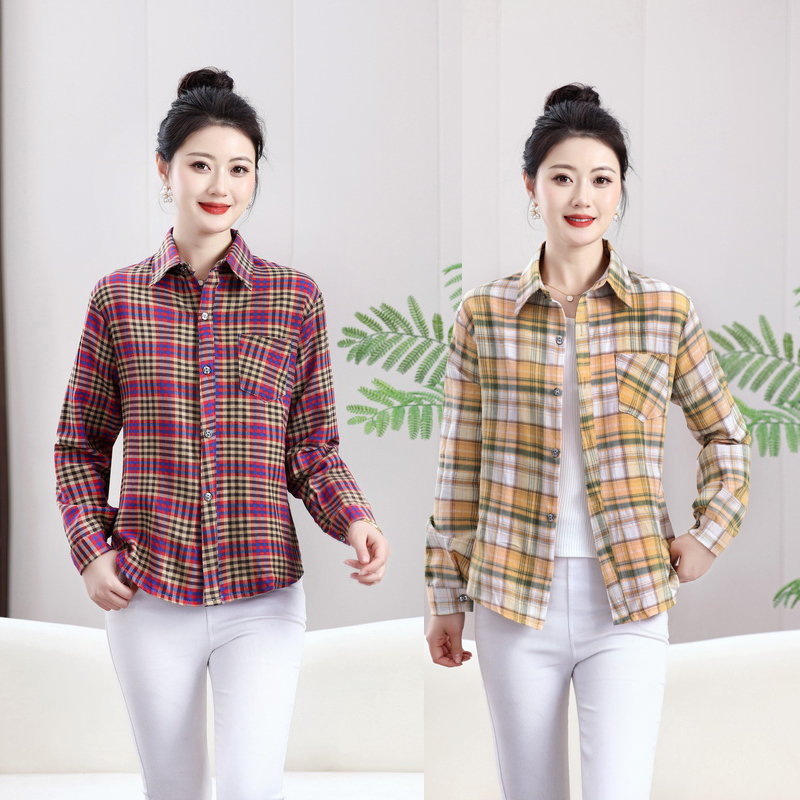 中年女装春秋纯棉格子长袖衬衫2025新款妈妈内搭衬衣中防晒服外套