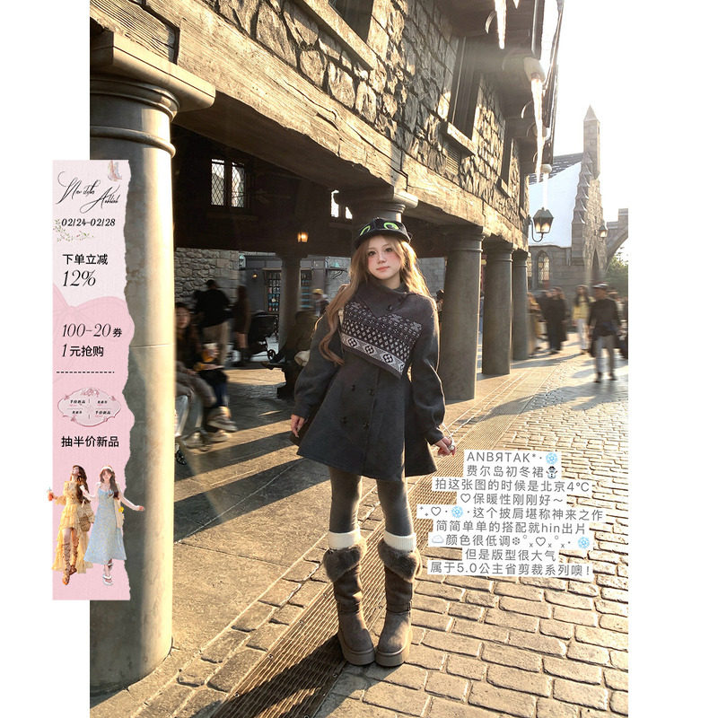 安妮不火 气质毛织披肩&双排扣呢外套裙女微胖大码费尔岛两件套装
