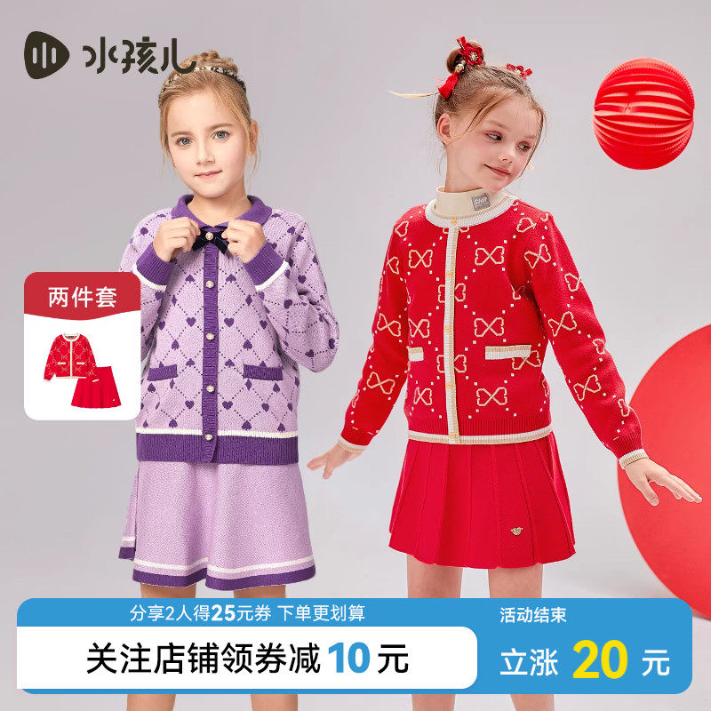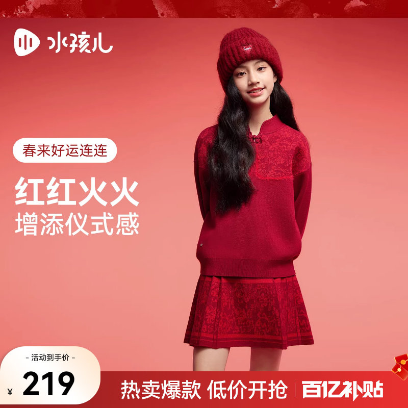 水孩儿女童套装2026春装新品新年红色毛衣半身裙大童针织两件套