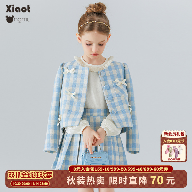 小童木 清新蓝白格女童小香风套装秋装2025新款儿童外套百褶裙套