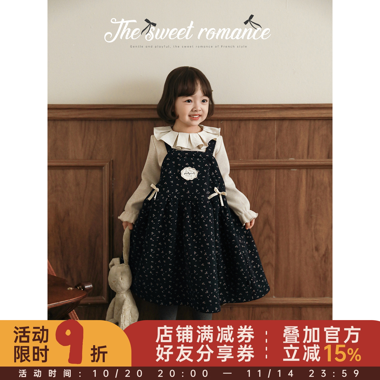 幼悠女童2025冬季新款加绒加厚翻领打底衫复古甜美碎花背带裙套装