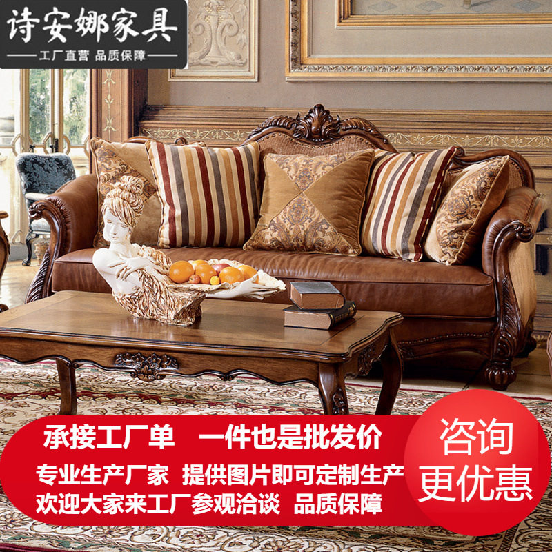美式皮艺沙发组合欧式实木沙发123法式别墅客厅整装家具奢华雕花