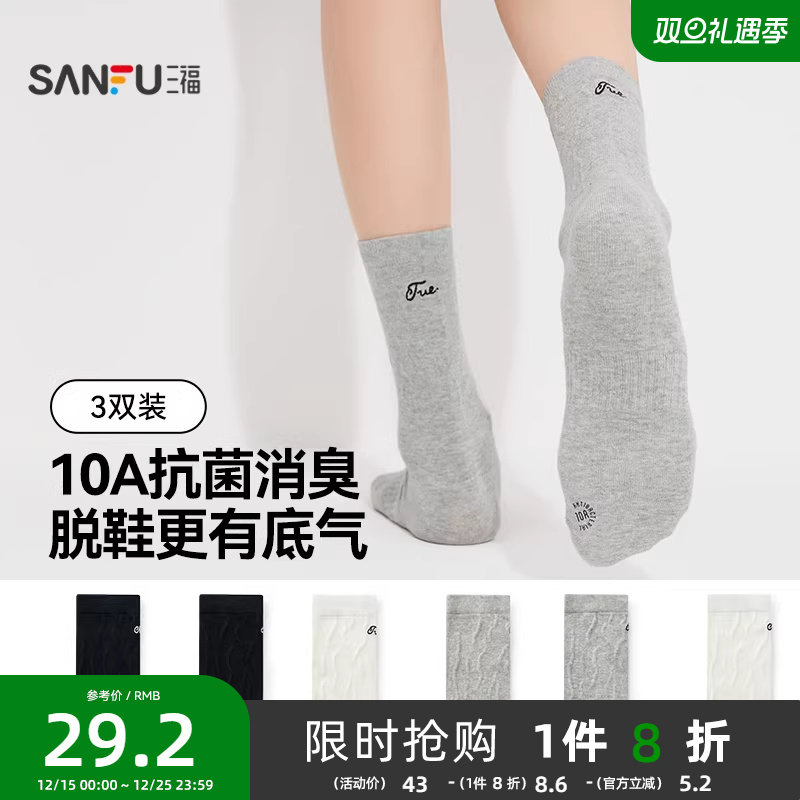 三福【三双装】 女短筒袜秋季简约基础字母抗菌消臭柔软女士袜子