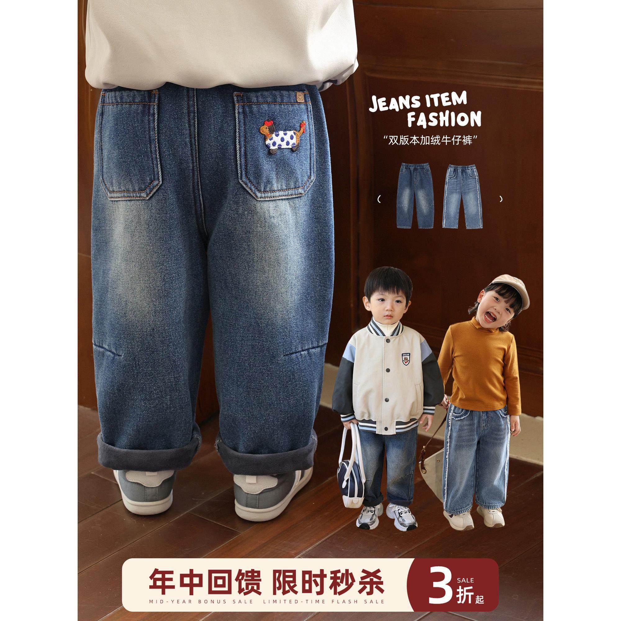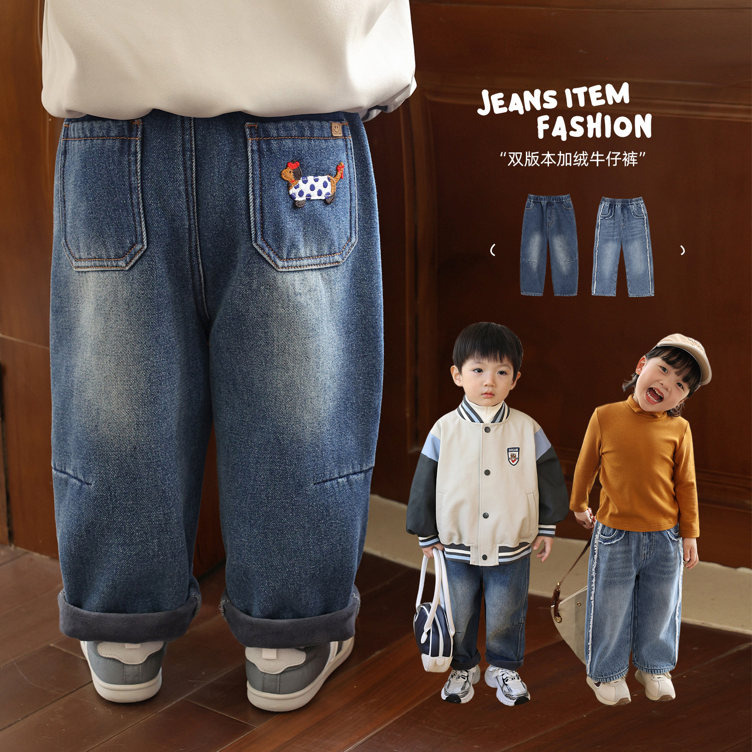 儿童牛仔裤加绒秋冬卡通男宝直筒阔腿裤1-8岁女童一体绒裤子冬季