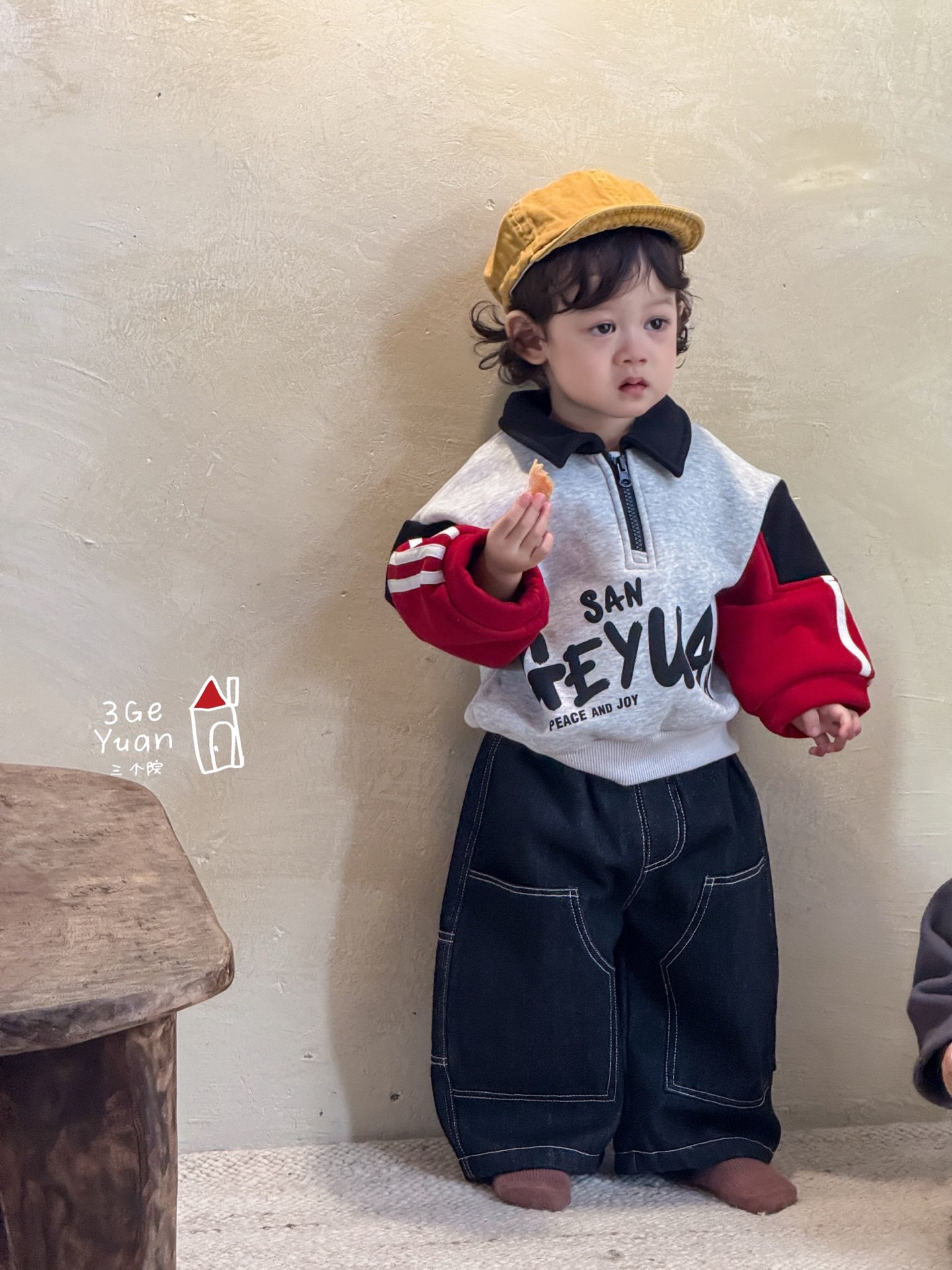 三个院秋冬加绒翻领卫衣拼色保暖字母上衣男宝韩版加厚牛仔裤百搭