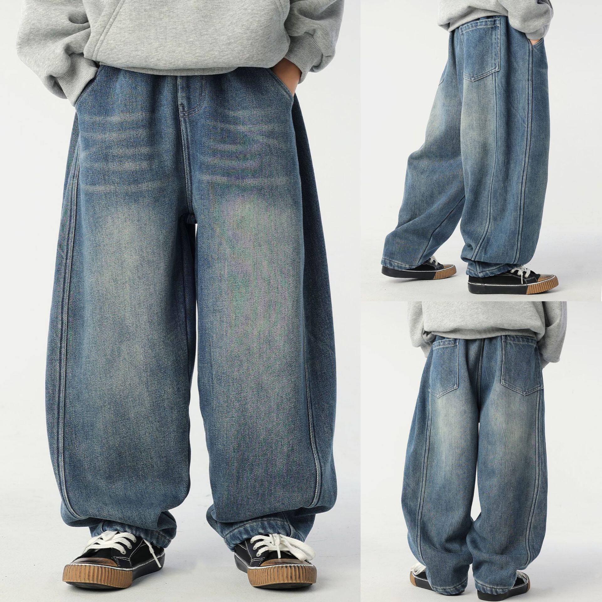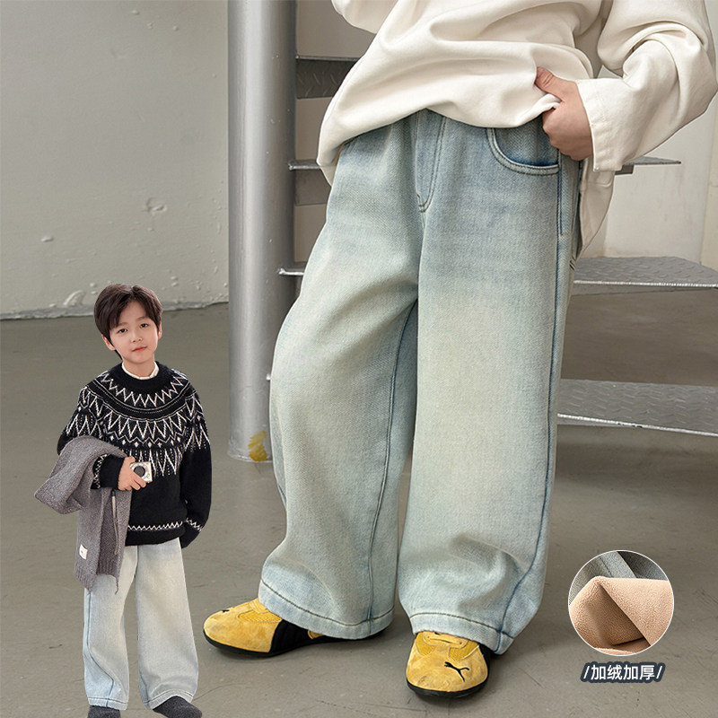 男童加绒牛仔裤儿童加绒保暖做旧复古直筒裤2025冬季新款男宝冬装