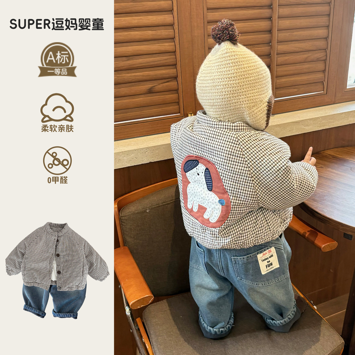 2025秋冬新品男宝卡通夹棉衬衫外套加绒牛仔裤婴幼儿外出保暖套装