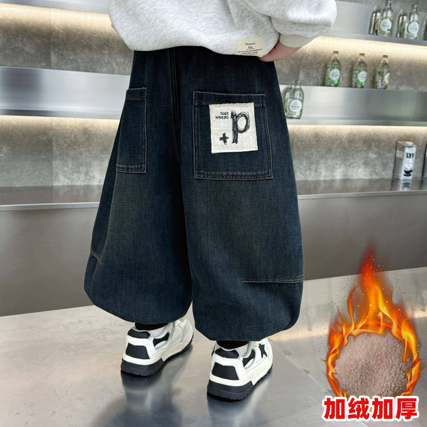 潮童轻奢男童加绒裤子秋冬2025新款儿童牛仔裤痞帅男宝冬季束腿裤