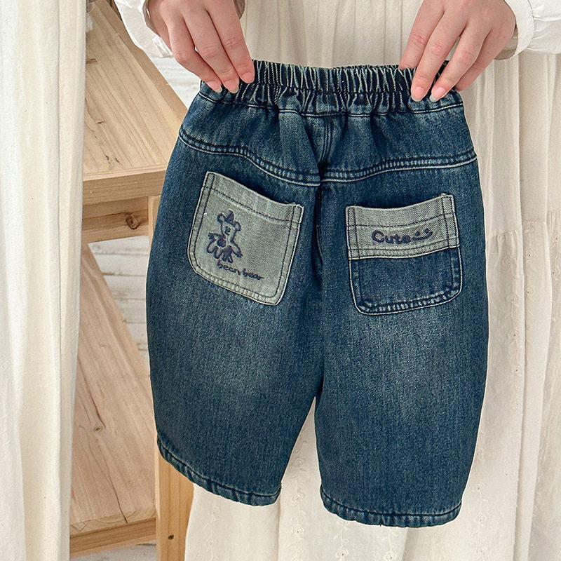 【一条过冬】女童加绒裤子刺绣笑脸冬季加厚男宝儿童糕糕绒牛仔裤