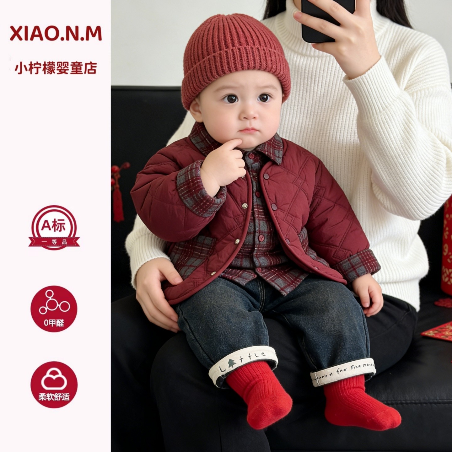 冬季新款婴幼儿加绒棉衣假两件外套套装男宝开衫牛仔裤年服两件套
