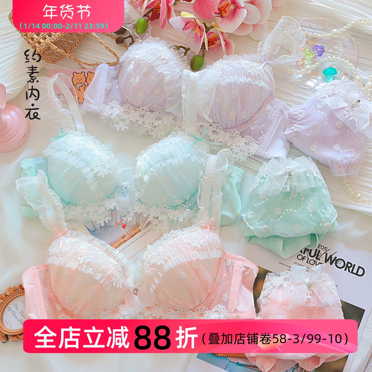 约素 浮生若梦~日系可爱蕾丝少女内衣大胸显小有钢圈文胸套装大码