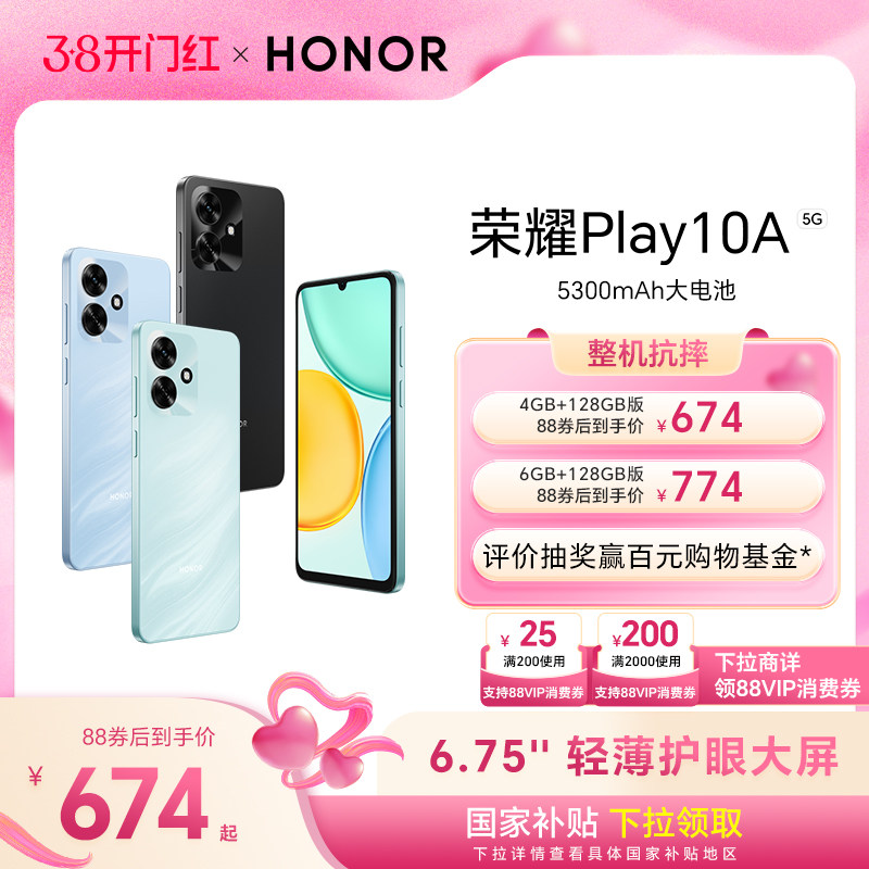 【官网】HONOR/荣耀Play10A 5G智能手机 5300mAh大电池 超长续航 轻薄护眼大屏 整机抗摔 学生老人机官方正品