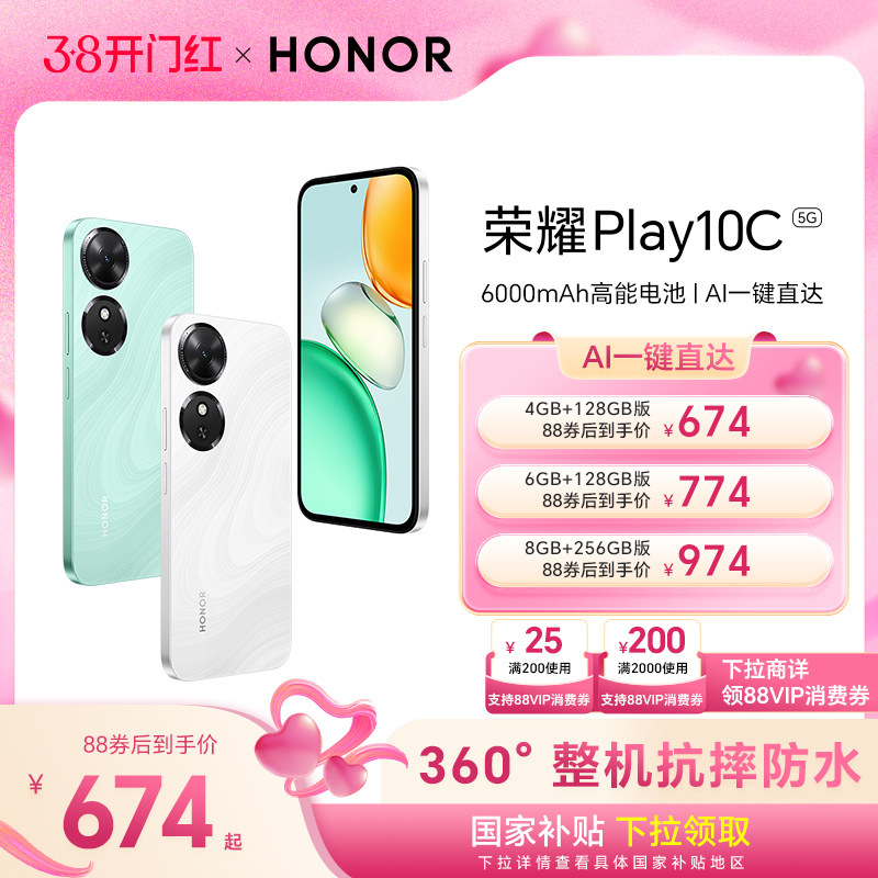 【官网】HONOR/荣耀Play10C 5G智能手机 6000mAh电池超长续航整机抗摔防水学生老人机政府补贴官方旗舰店正品