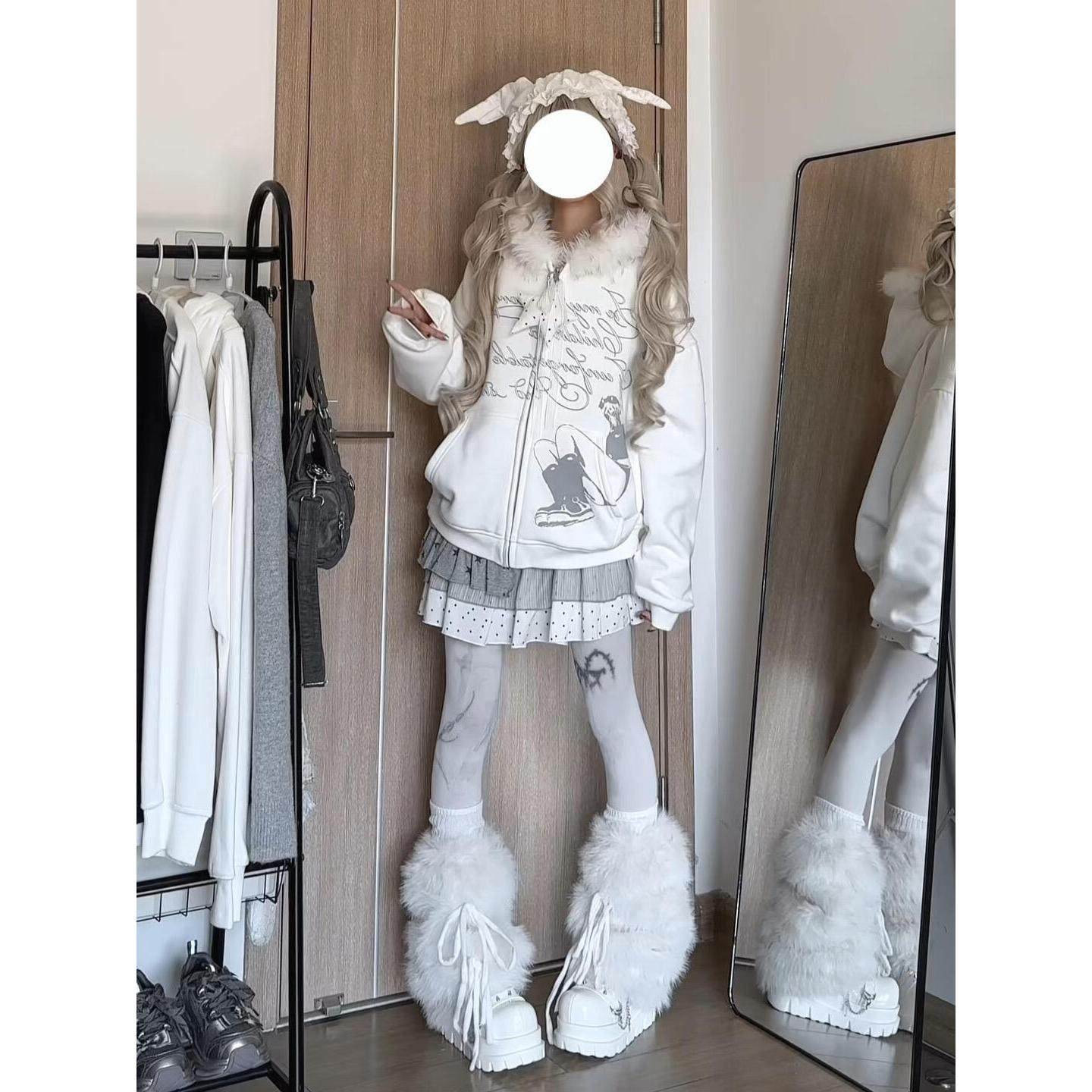 y2k轻亚满印毛领开衫卫衣条纹短裙套装女秋冬款宽松连帽外套上衣