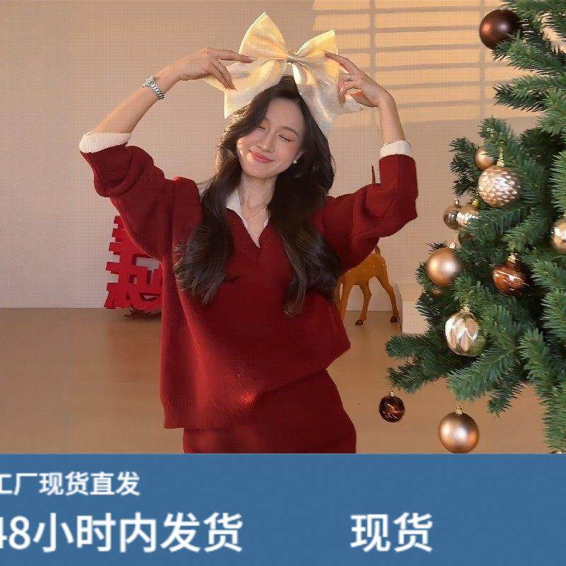 圣诞新年氛围感红色翻领毛衣短裙套装女秋冬季慵懒休闲显瘦两件套