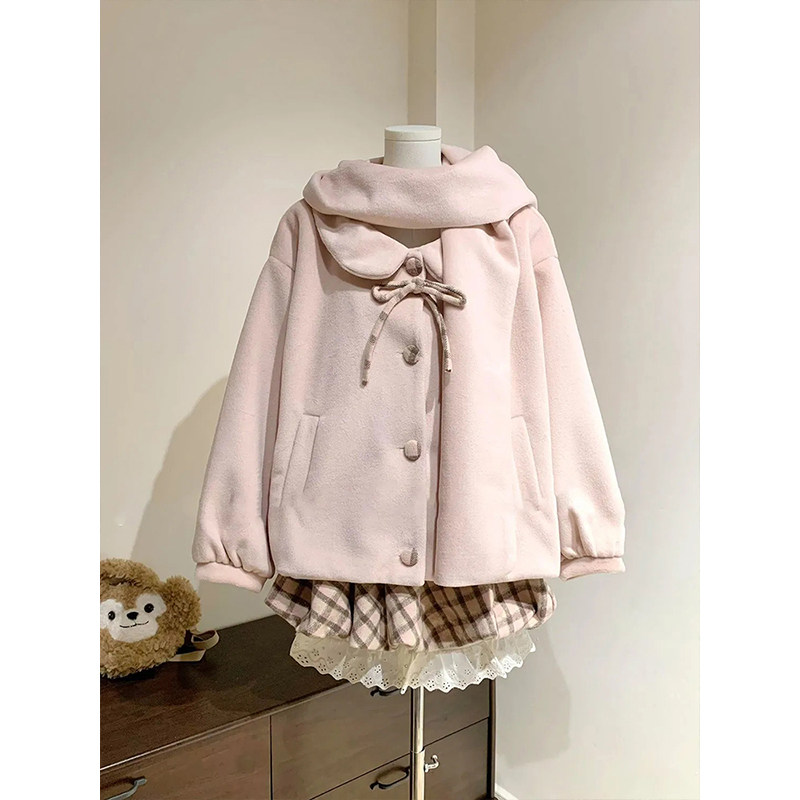 小个子粉色甜美可爱围巾连帽毛呢外套格子蕾丝拼接短裙套装女秋冬