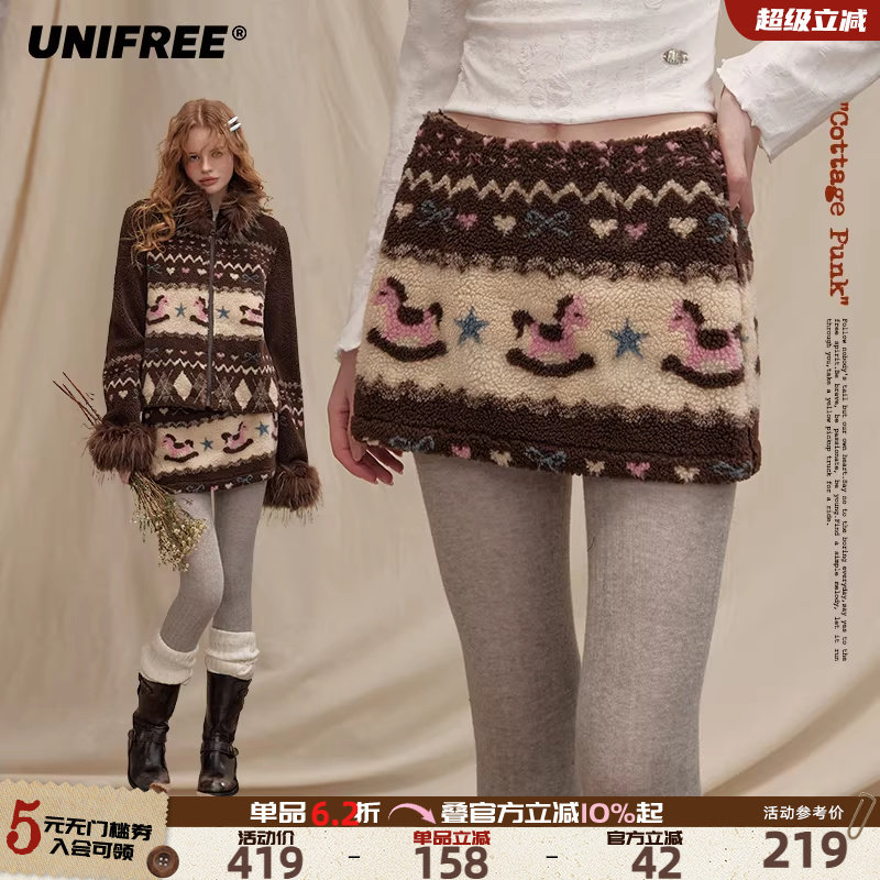 UNIFREE棕色费尔岛半身裙女羊羔毛秋冬加厚复古保暖包臀短裙套装