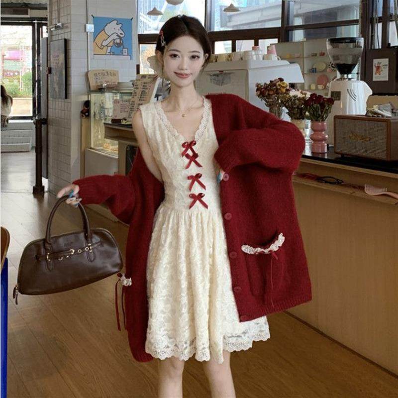 大码温柔风显瘦短裙套装女秋冬胖mm红色毛衣外套吊带连衣裙两件套