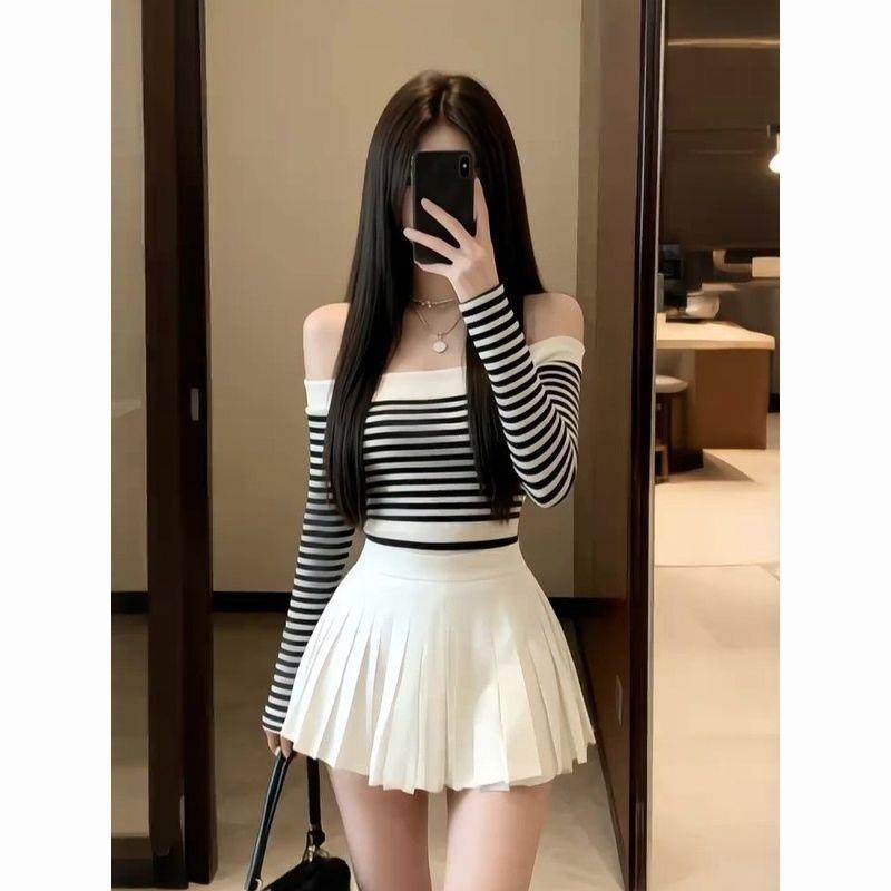 韩系学院风一字肩条纹撞色长袖T恤百褶短裙套装女秋冬减龄两件套