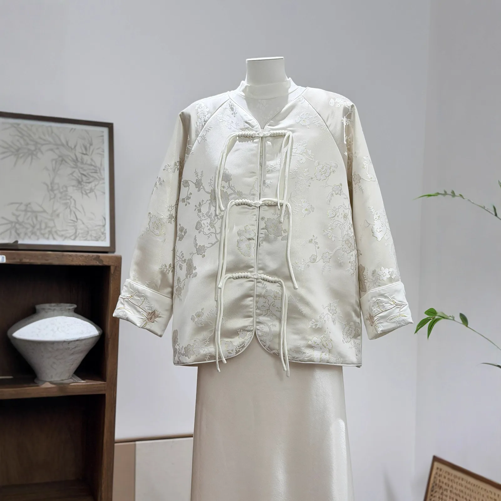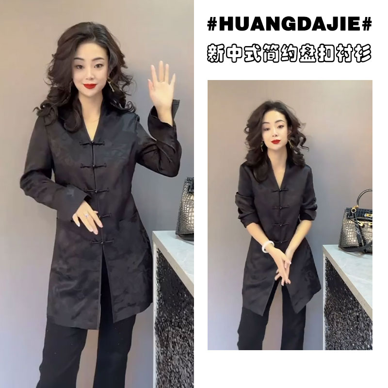 新中式国风V领提花衬衫女2025新款中长款唐装上衣盘扣重工衬衣春