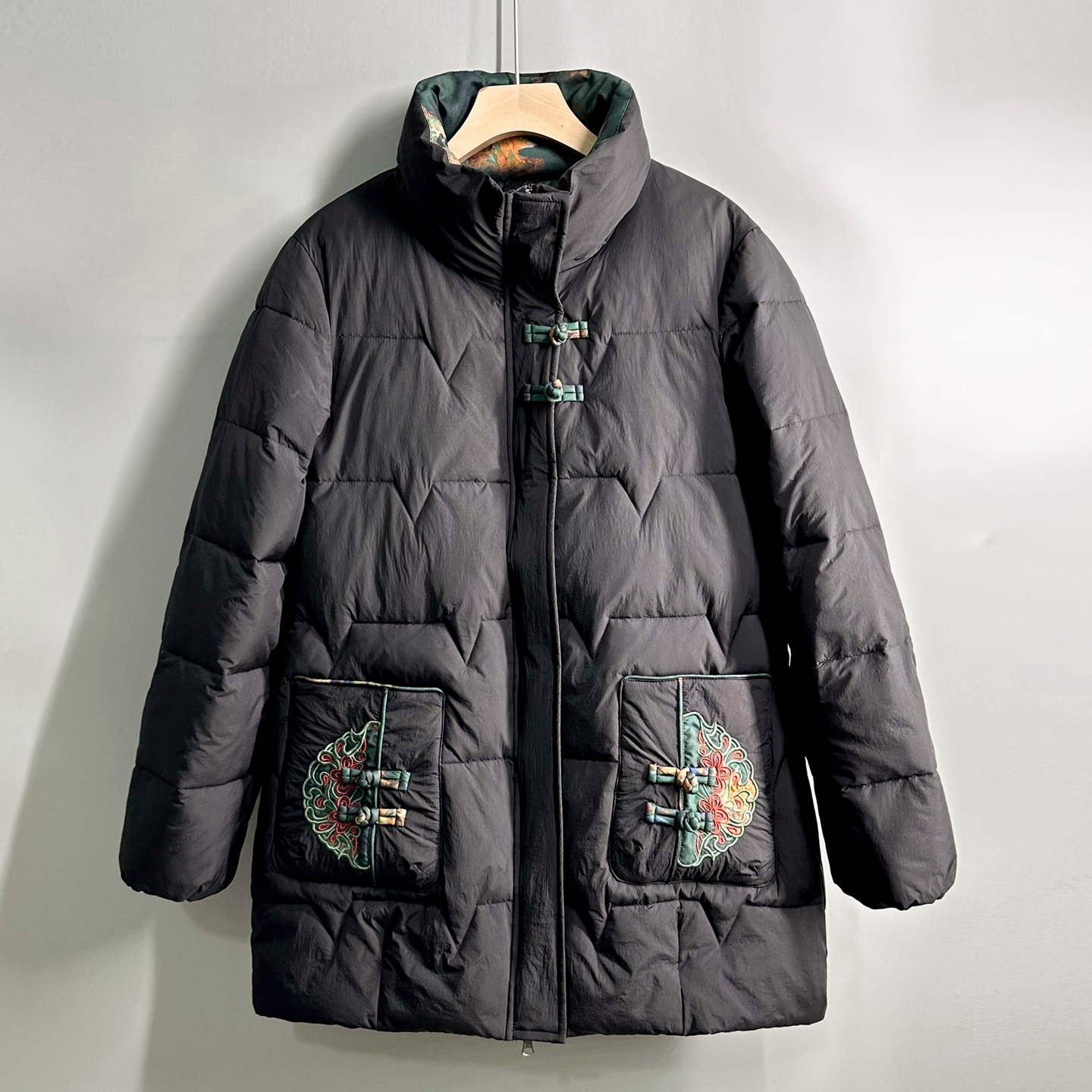 刺绣绣花国潮中长款过膝加厚羽绒棉服女冬绣花唐装中国风旗袍外套