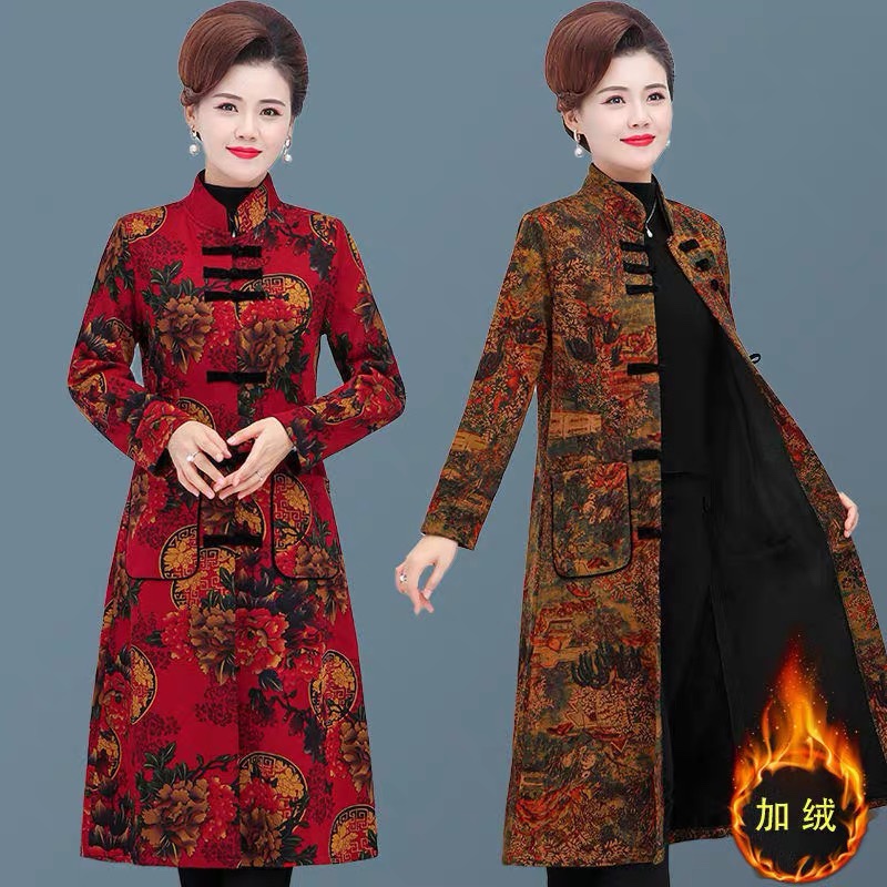 复古风中长款棉服中老年女士花色唐装加绒加厚妈妈秋冬季保暖棉袄
