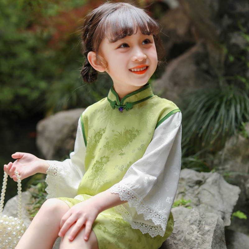 夏季新款复古洋气中国风儿童旗袍女孩唐装汉服中长袖拼接连衣裙夏