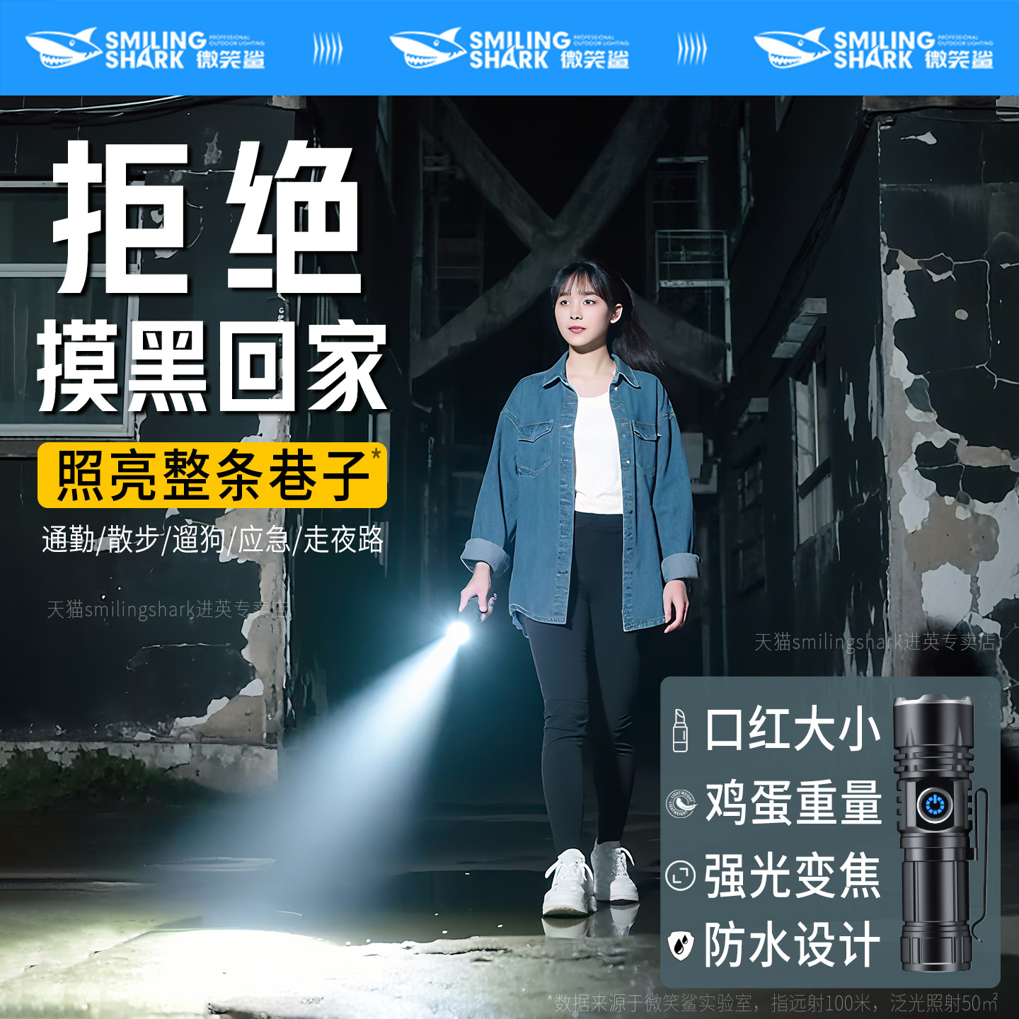微笑鲨强光小手电筒充电超亮户外远射家用小型便携露营儿童长续航
