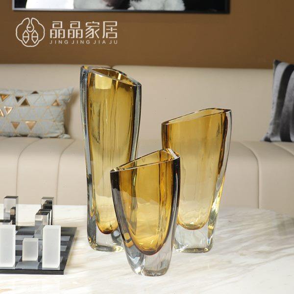 北欧新款高档玻璃花瓶黄三角型加厚插花器别墅酒店样板房摆件饰品