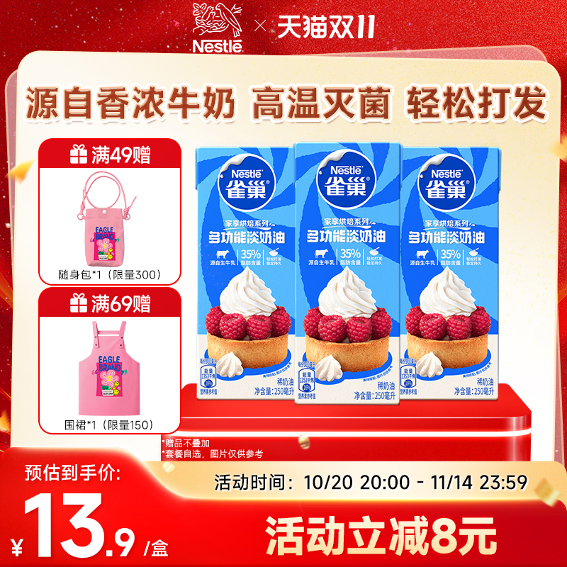 雀巢动物淡奶油家用烘焙蛋挞蛋糕裱花专用原料稀奶油250ml 6月产