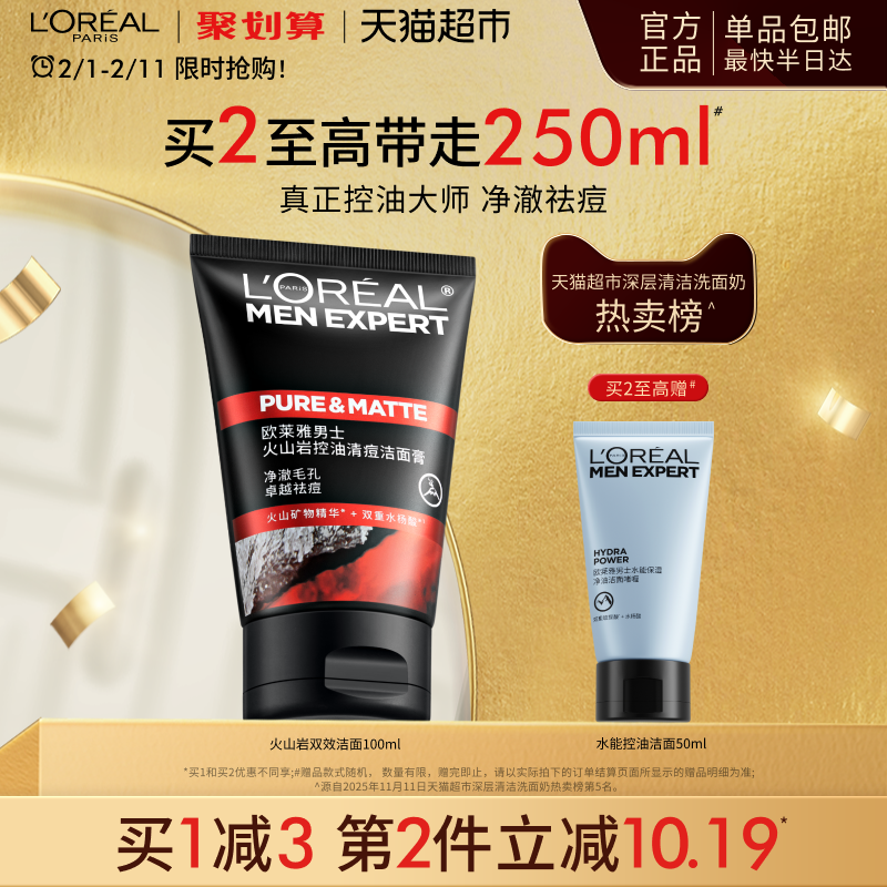 欧莱雅男士专用洗面奶火山泥控油清痘深层清洁毛孔去黑头洁面乳男