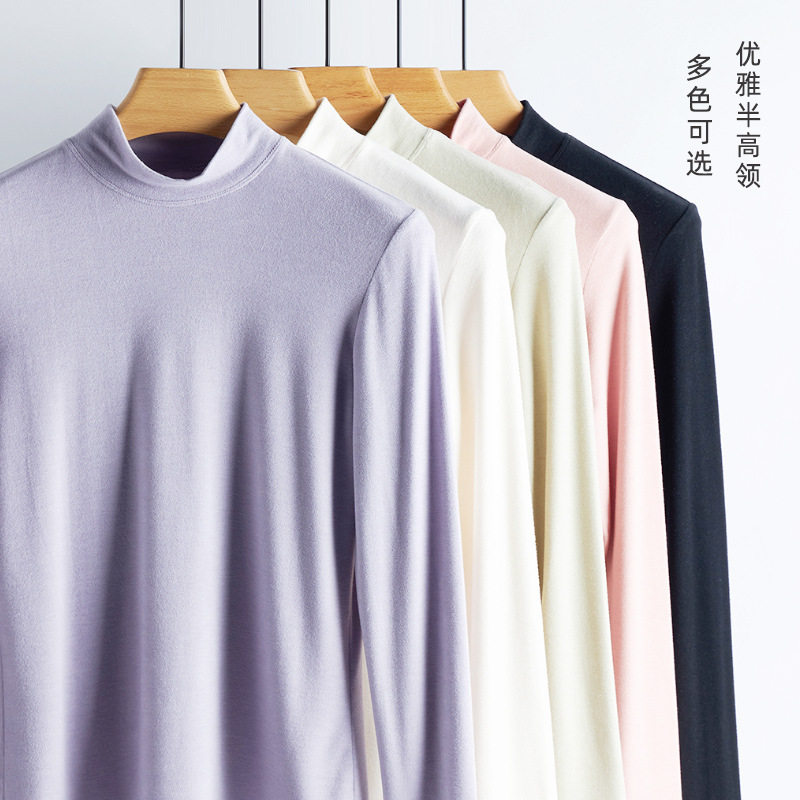 女款莫代尔高领长袖素色打底衫高弹力修身T恤衫休闲外穿通勤薄软