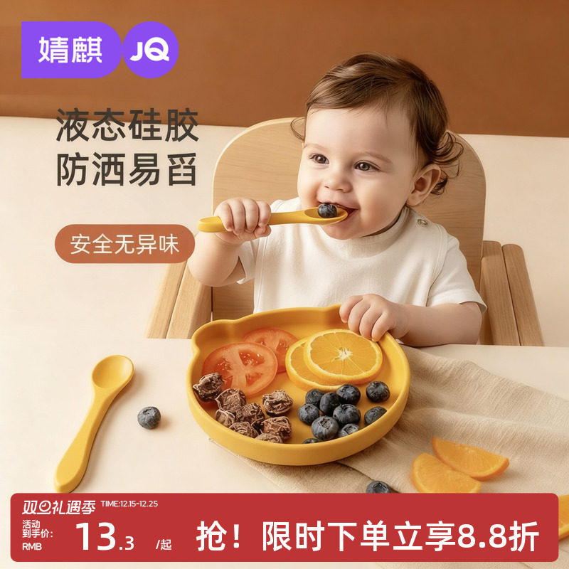 宝宝餐盘吸盘式婴儿儿童硅胶分格辅食盘学吃饭训练勺子餐具套装附
