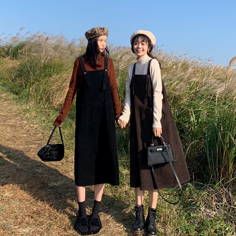 灯芯绒背带裙女连衣裙秋冬新款韩版法式复古过膝显瘦中长款吊带裙
