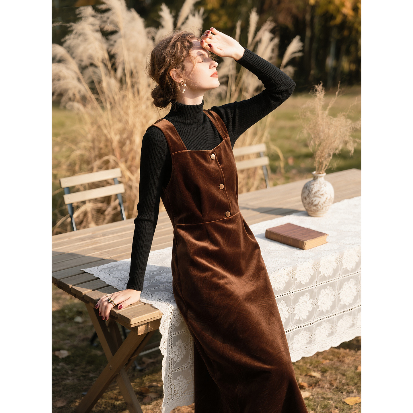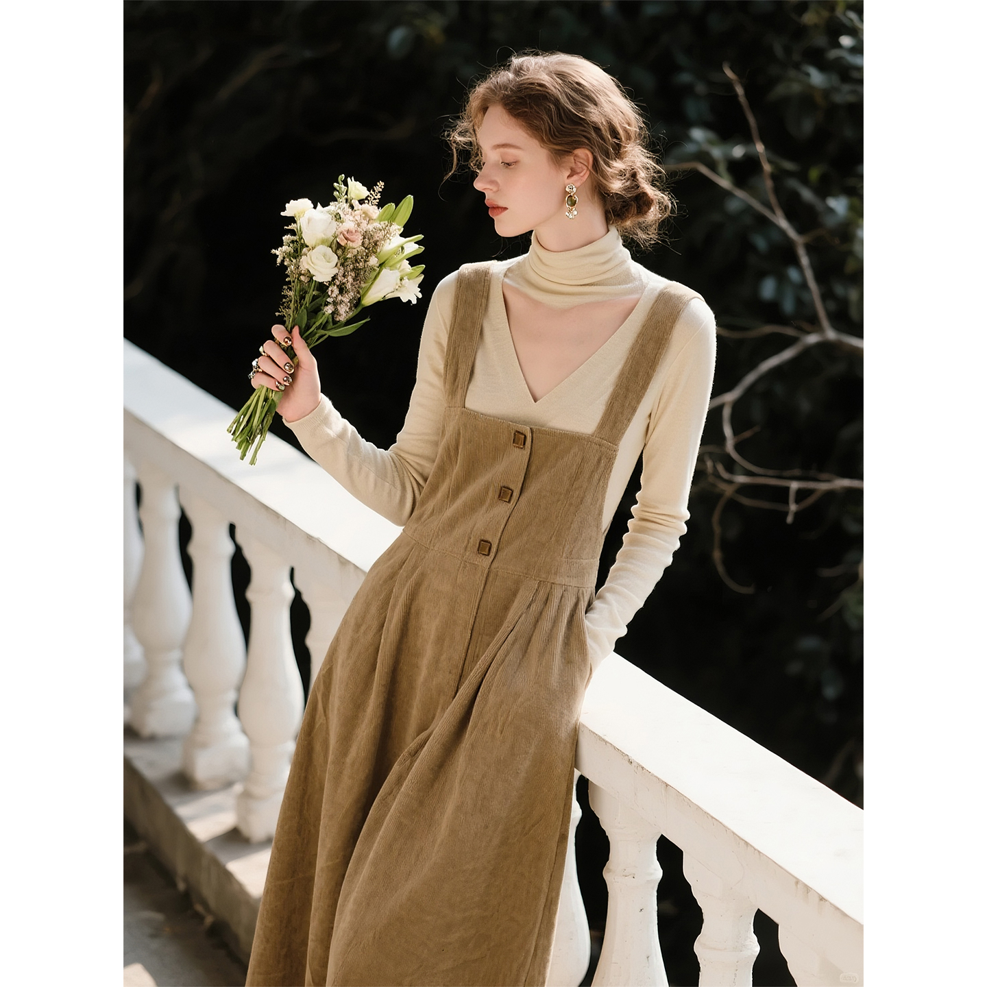 2025秋冬新款背心裙灯芯绒背带裙复古气质长裙女士收腰长款连衣裙