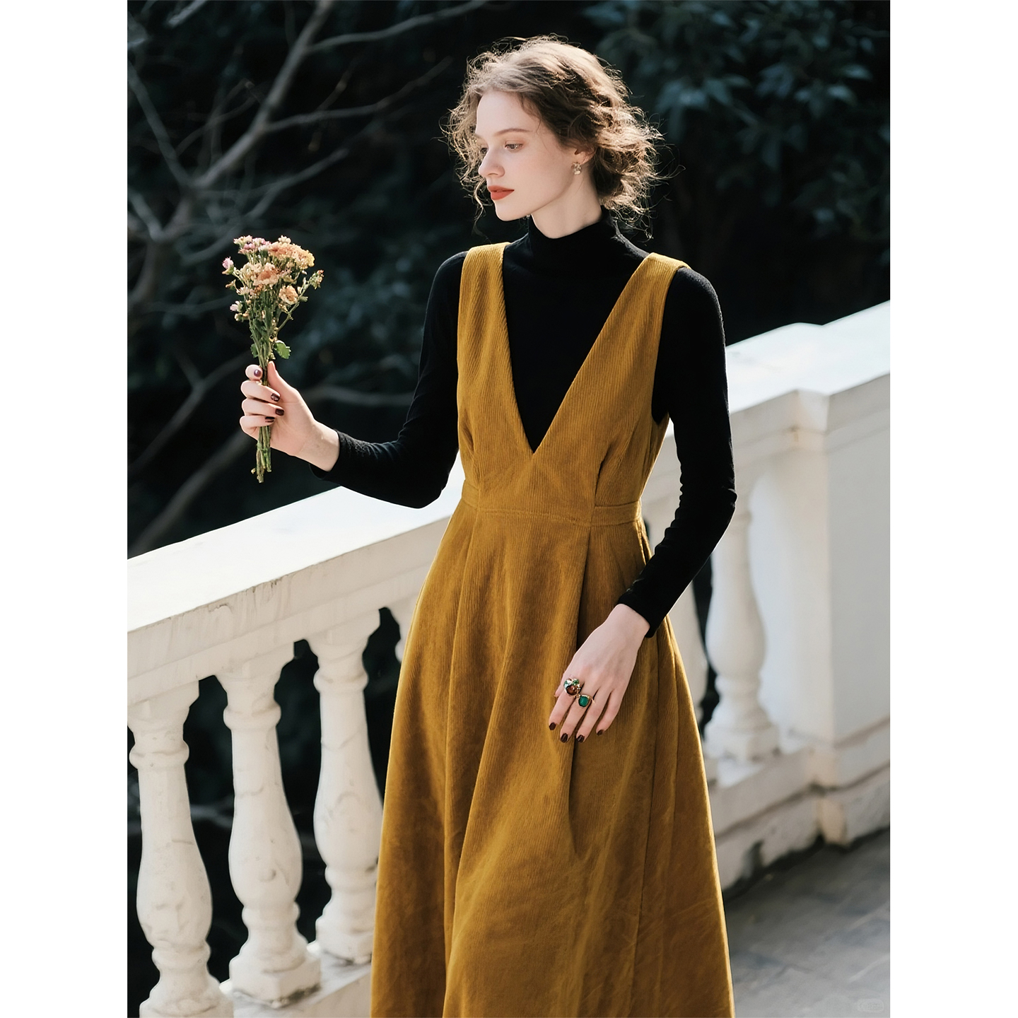 姜黄色V领灯芯绒无袖背带连衣裙女2025年秋冬新款轻奢风气质长裙