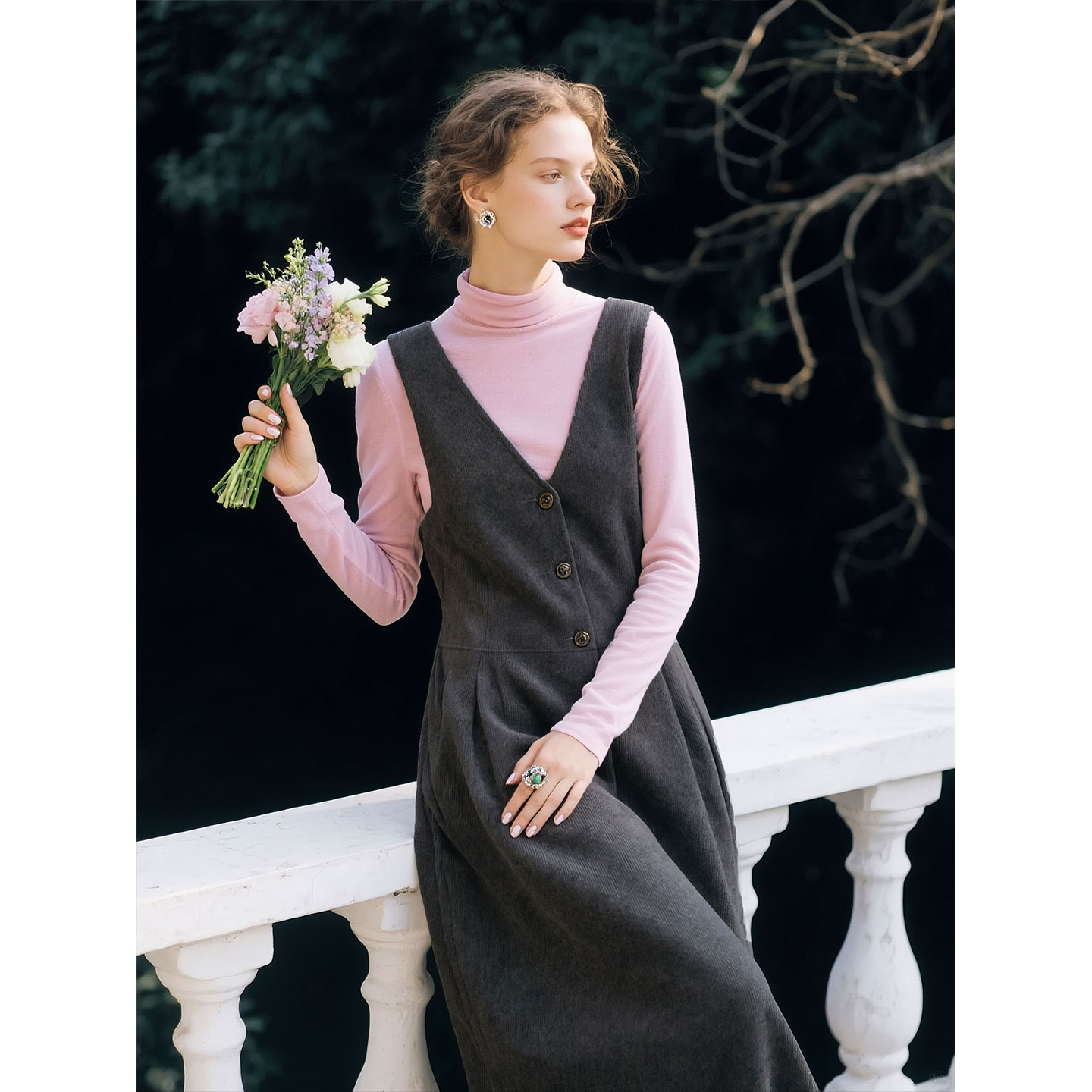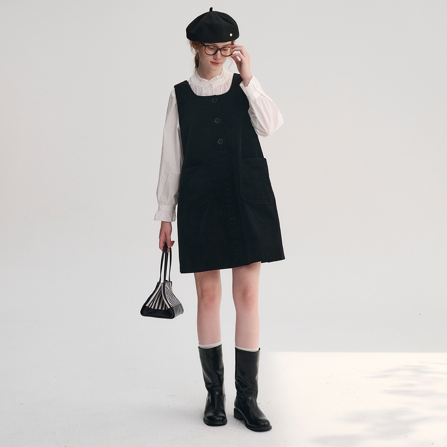 秋冬款复古水洗全棉灯芯绒背带裙女纯色气质单排扣无袖背心连衣裙