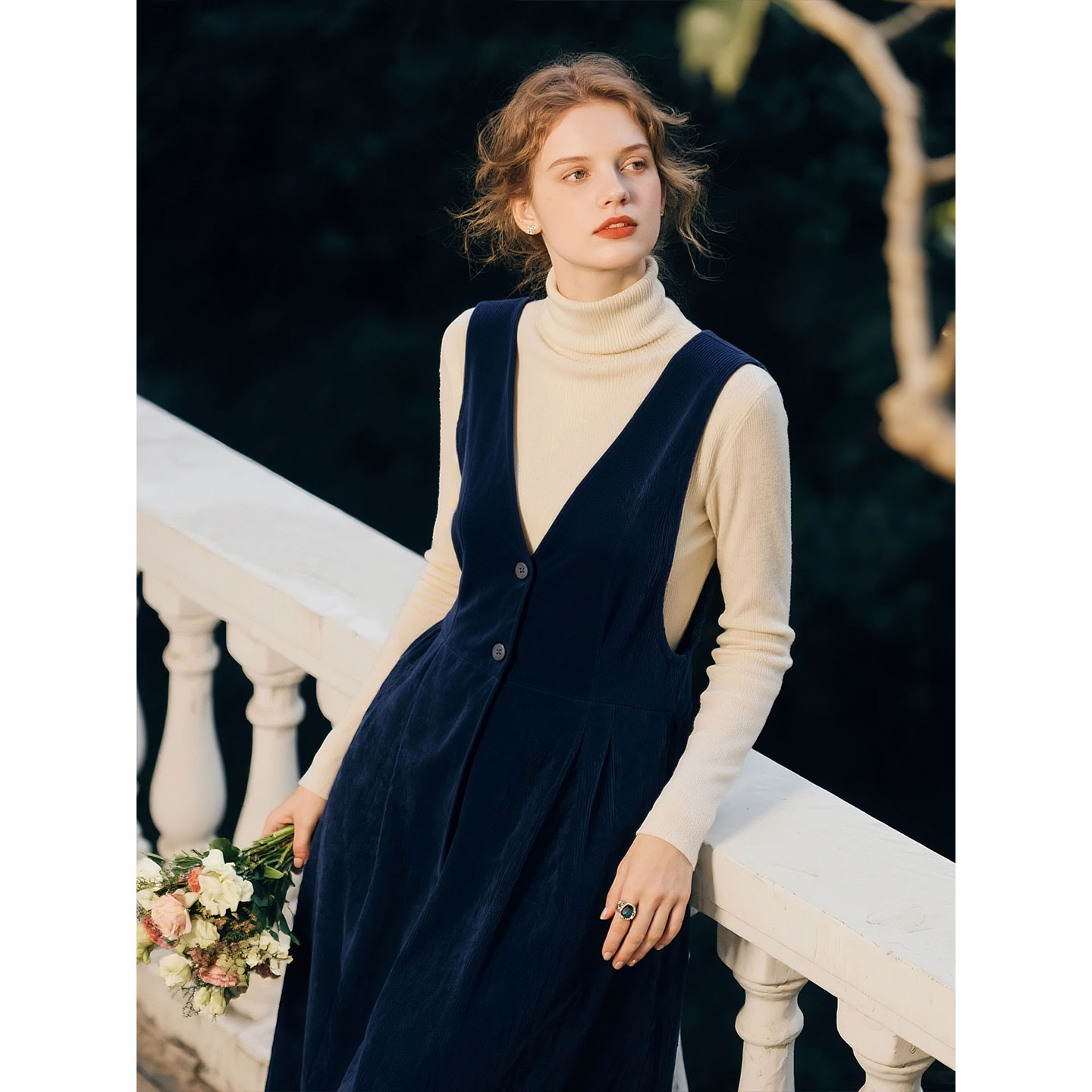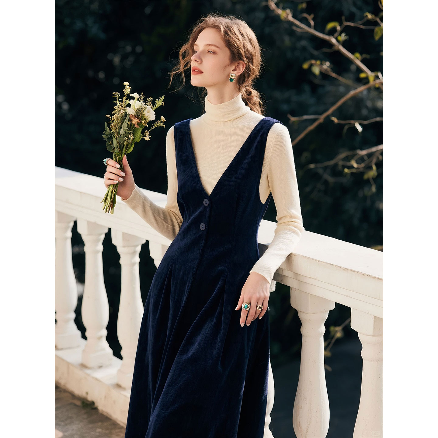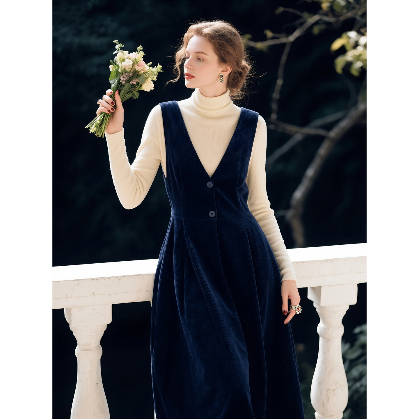 蓝色V领灯芯绒背带连衣裙女2025年秋冬新款法式复古叠穿连衣裙