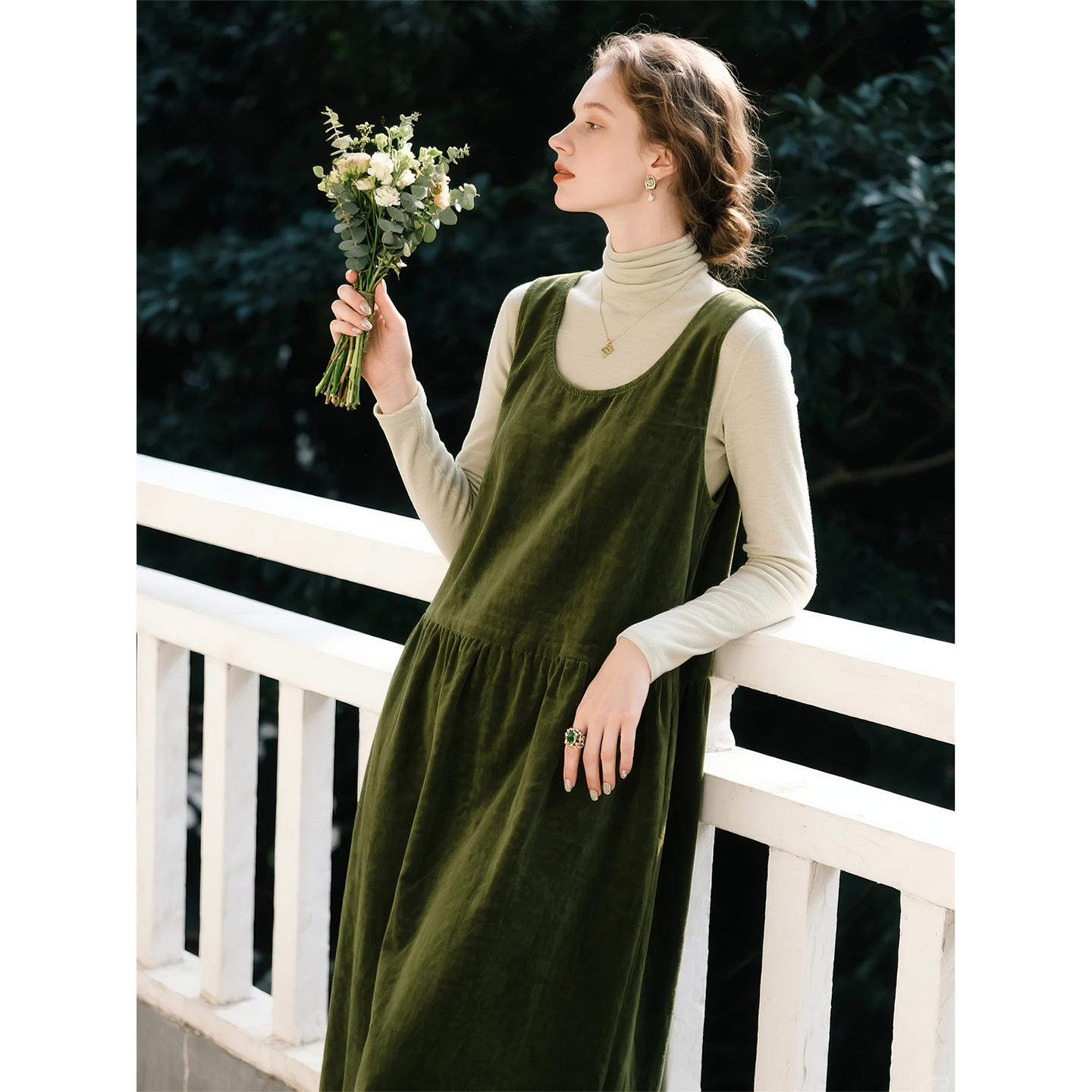 军绿色灯芯绒背带连衣裙女2025秋冬新款法式复古气质文艺叠穿裙子