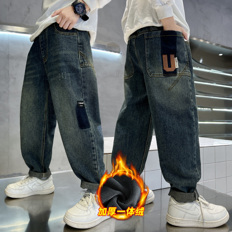 男童一体加绒牛仔裤子春秋冬款2025新款冬季中大儿童冬装加厚长裤