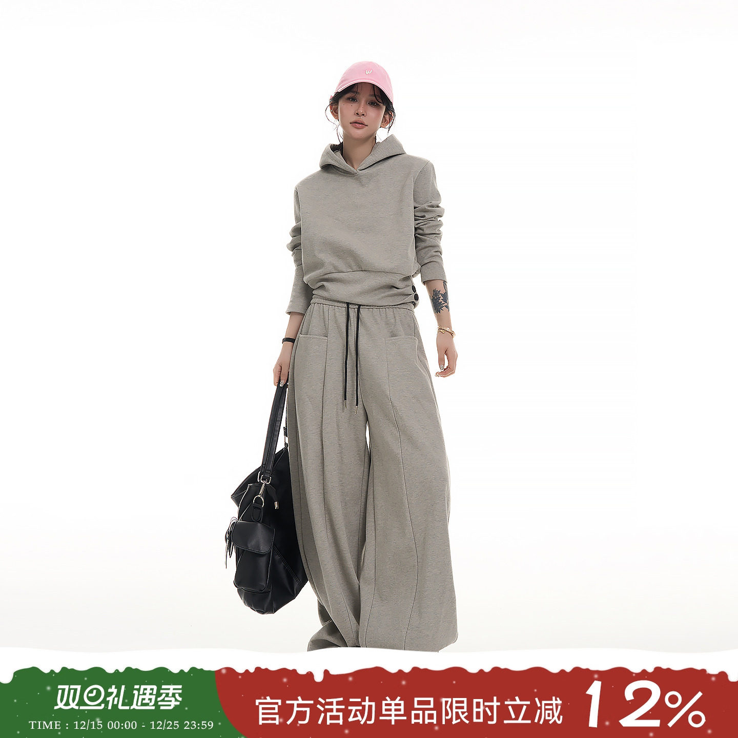 吴童童设计感收腰连帽长袖卫衣女秋冬韩系高级感修身上衣长裤套装