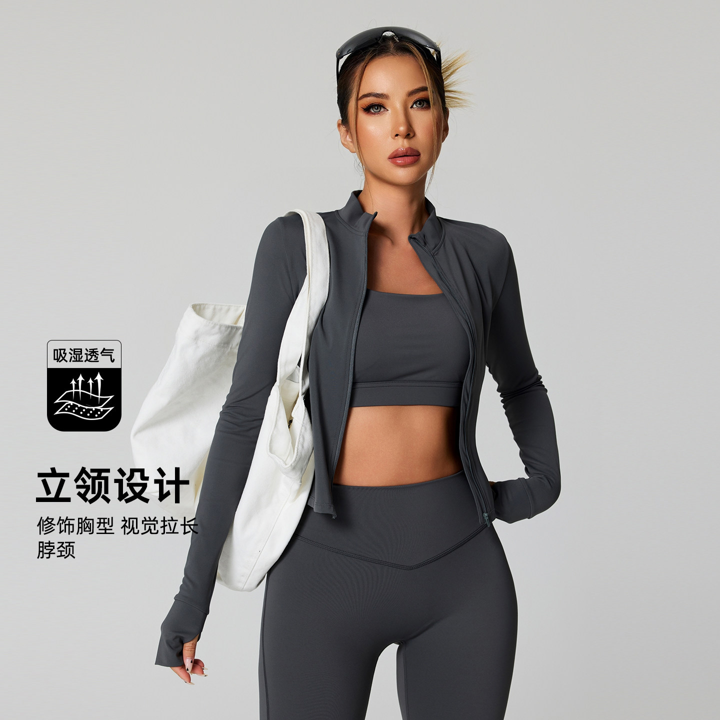修身显瘦瑜伽套装女跑步户外运动立领外套高腰收腹微喇长裤两件套